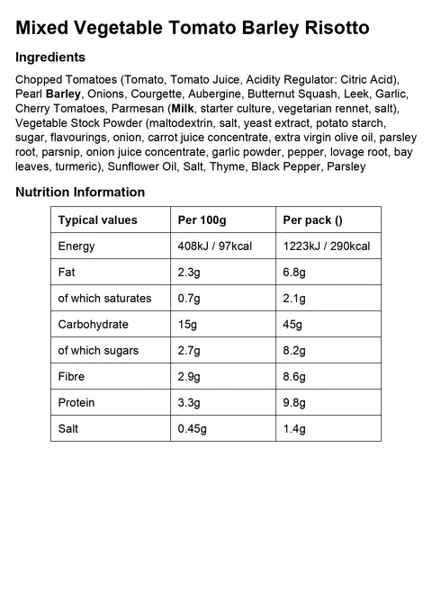 Barley contributes fibre, while vegetables add colour and variety. Tomato base provides flavour.