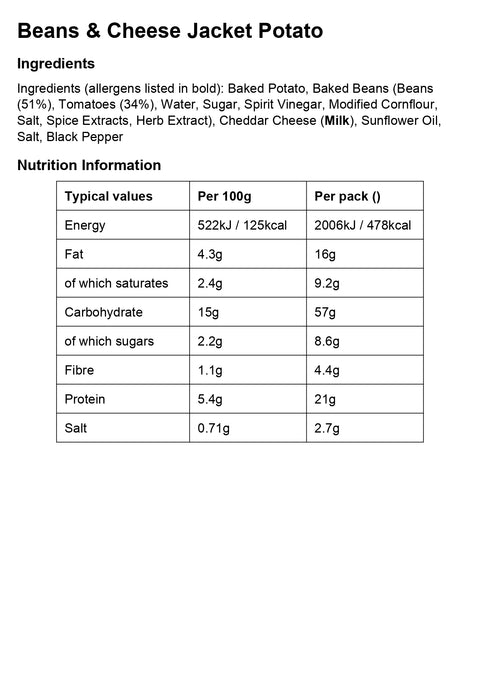 Baked beans provide fibre and plant protein, while cheese adds calcium. Potatoes supply carbohydrates for energy.