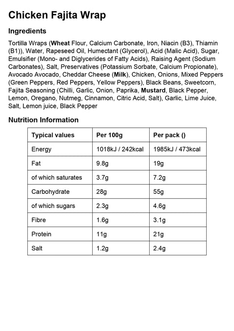 Includes protein from chicken and vegetables such as peppers and onions. Finished in a wholegrain wrap.