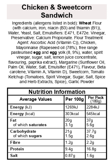 A comforting blend of tender diced chicken breast and sweetcorn folded into a seasoned mayo base with a hint of ketchup, served on soft bread with vegan spread.